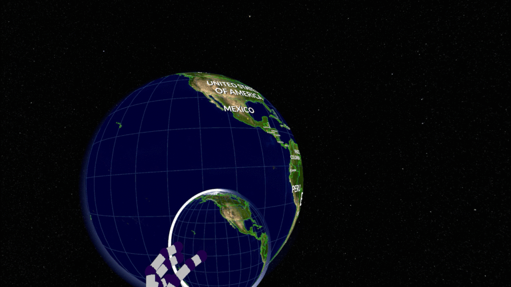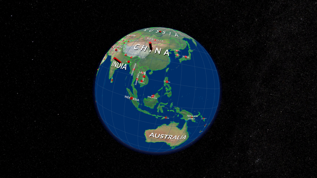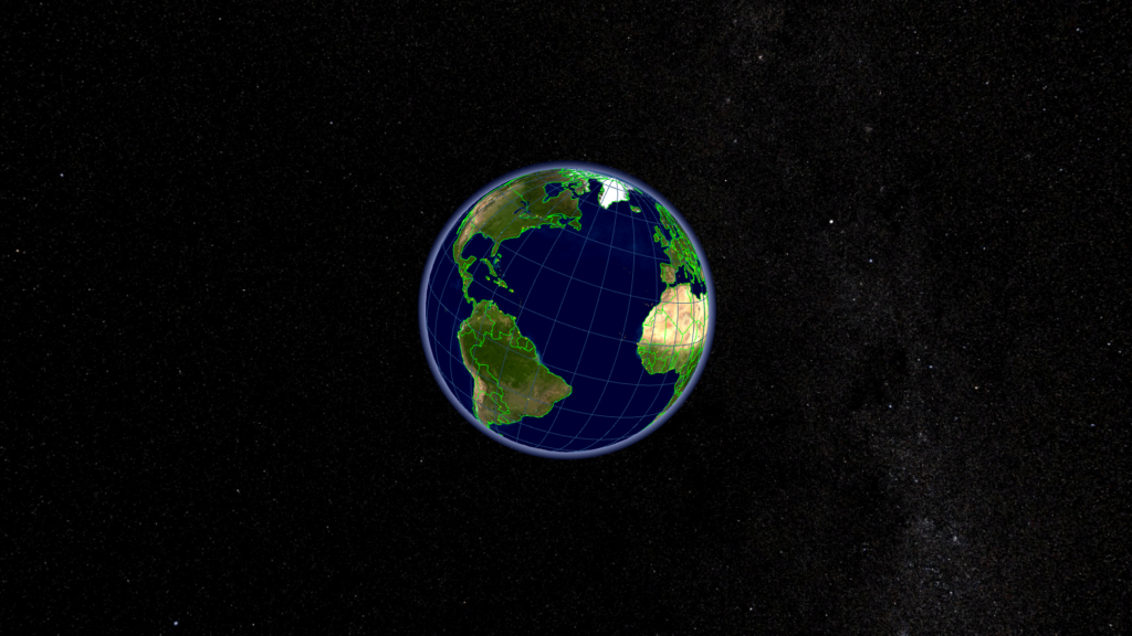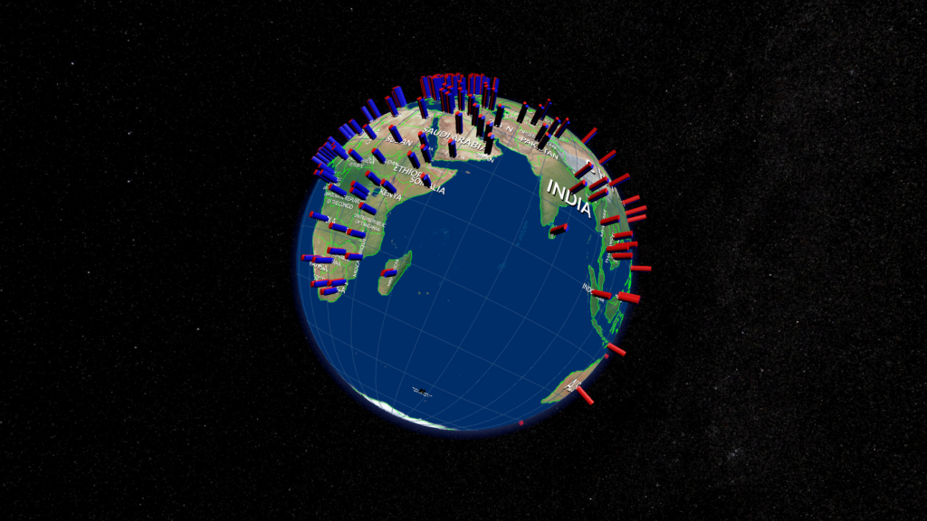 A second representation of the globe mirrors the rotation of the control globe and floats in front of you in space. This globe is much larger which allows for an easier and more detailed view on the data. We call this the display globe.