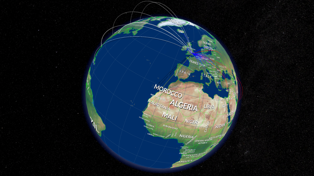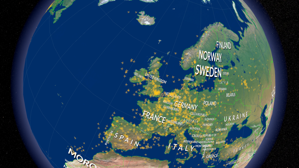 In this visualization mode all planes that are currently in the air are displayed on the globe. The data gets continuously updated at a short time interval to deliver a live view on all planes being in-flight at this very moment. This is ideal to see the distribution of flights around our planet. In data visualization this is called a dot map.