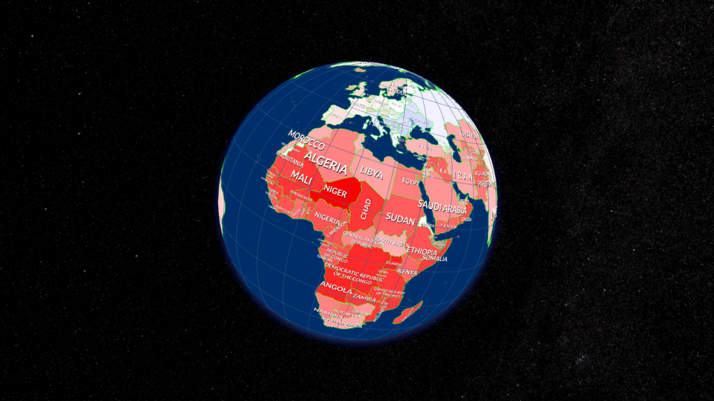 choropleth map divides geographic areas in regions that have a specific color on a gradient in relation to a data variable. This visualization allows you to compare different countries to each other, for example GDP per capita, percentage of the population having access to electricity or population growth.
